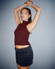 De Capricia is de perfecte basis. Het model is uitgevoerd in marron en heeft een hoge hals en een mouwloos ontwerp in een geribde stof met een knoopsluiting op de rug. Combineer met onze Laag uitgesneden denim minirok voor een leuke 'fit'.