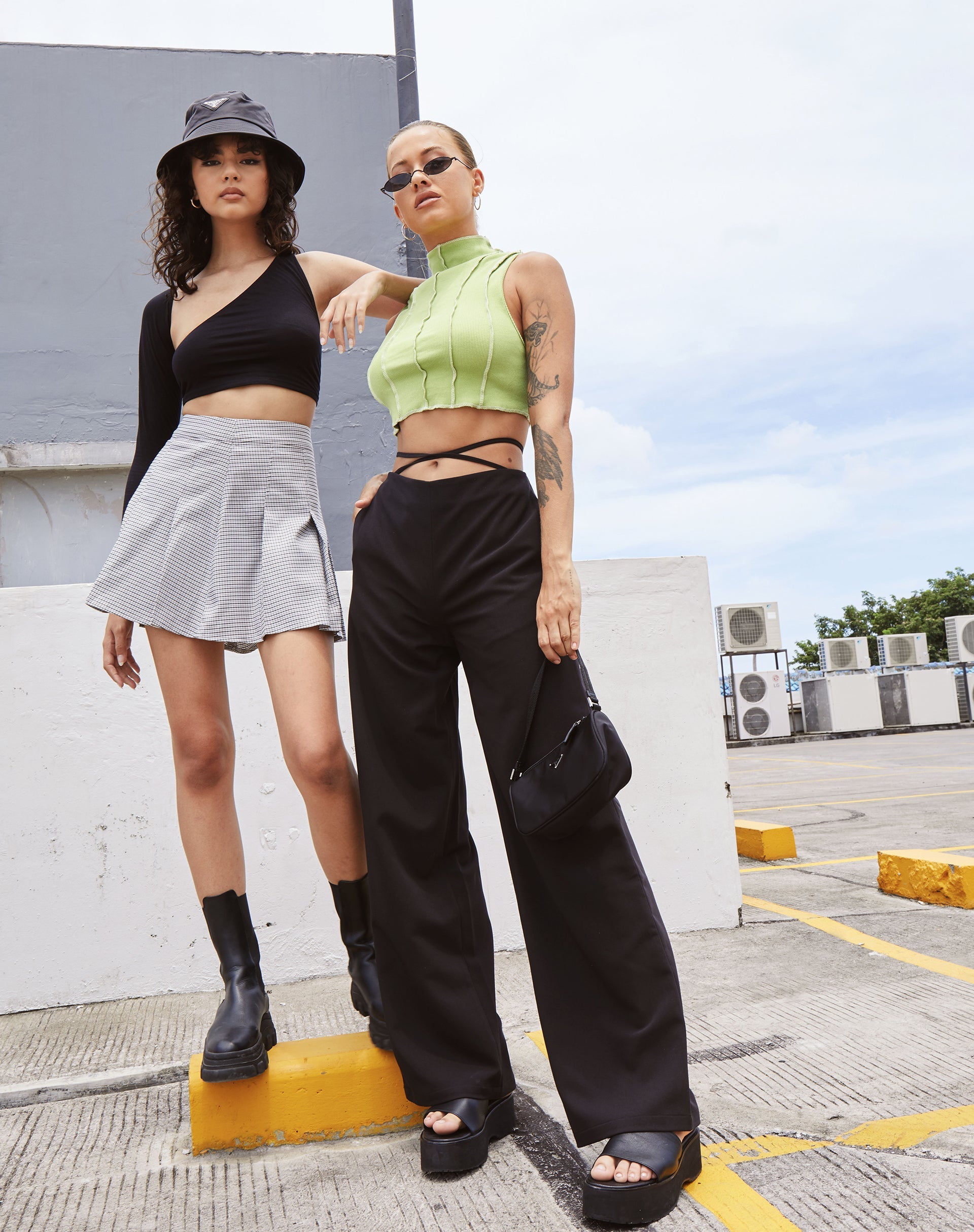 Onze Carga is de korte maar zoete rok die je nodig hebt. In een zwart-grijze ruitjesprint met een mini pasvorm, brede tailleband met riemlussen en plooidetails. Wij hebben de onze gestyled met een Ryals top, Saken blazeren kniehoge laarzen.