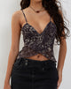 Bedrukt mesh vlindertop met dunne verstelbare bandjes en een gelaagde splitzoom in botanisch bruine batikprint. Maak de 'fit' compleet met onze Denim Mini.