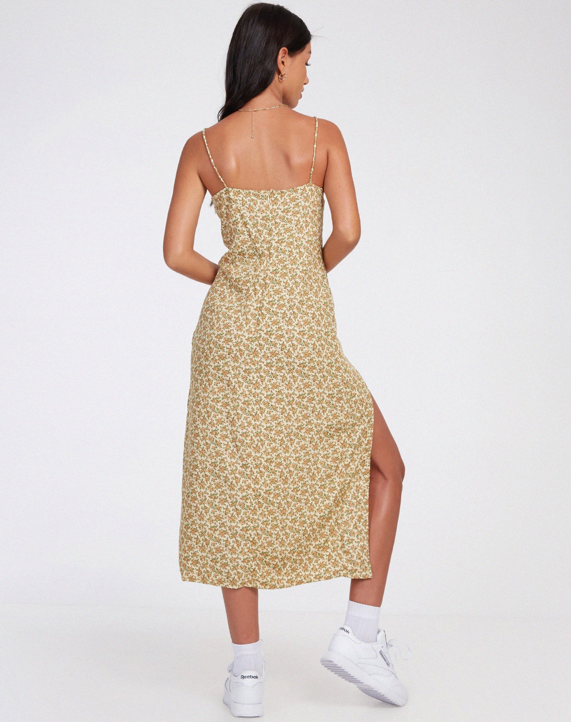 De jurk geschikt voor de zomer. In een lichtgele printheeft het een vierkante halslijn, dunne bandjes, verstelbare strikbandjes, een hoge beenuitsnijding aan de zijkant en een midi model. Maak de look af met een paar witte sportschoenen.