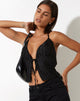 Voeg toe aan je leuke crop collectie met onze Dama top. Met een open voorkant met strikdetail, diepe halslijn en dunne bandjes in gekreukeld zwart. Eenvoudig te stylen met onze bijpassende Bian broek.