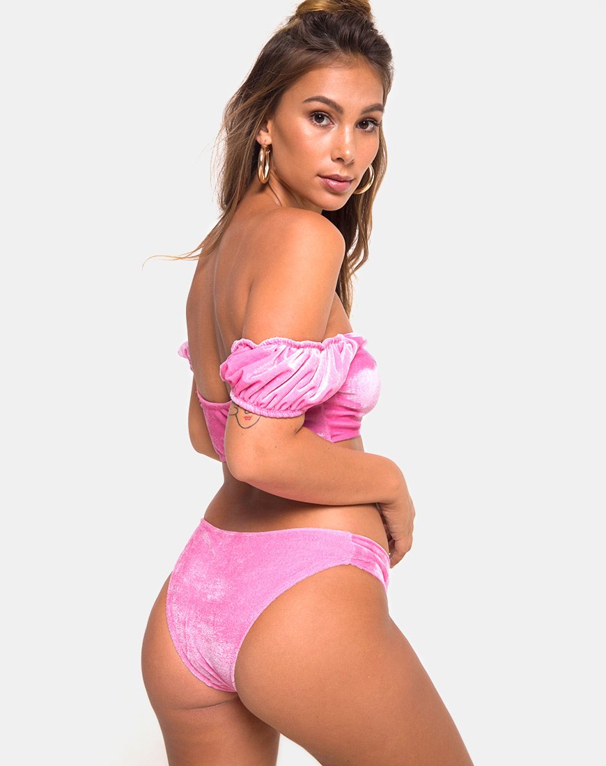 Wees de ultieme beach babe in pasteltinten en fluweel. Met de Fabienne bikini ben je in een paar seconden klaar voor de zon. Het topje heeft een off the shoulder stijl met een sweetheart halslijn en schattige ruches. Maak het af met het Fabienne bikinibroekje, een bodychain en metallic flatform sandaal met glitterknotjes voor pool party vibes.
