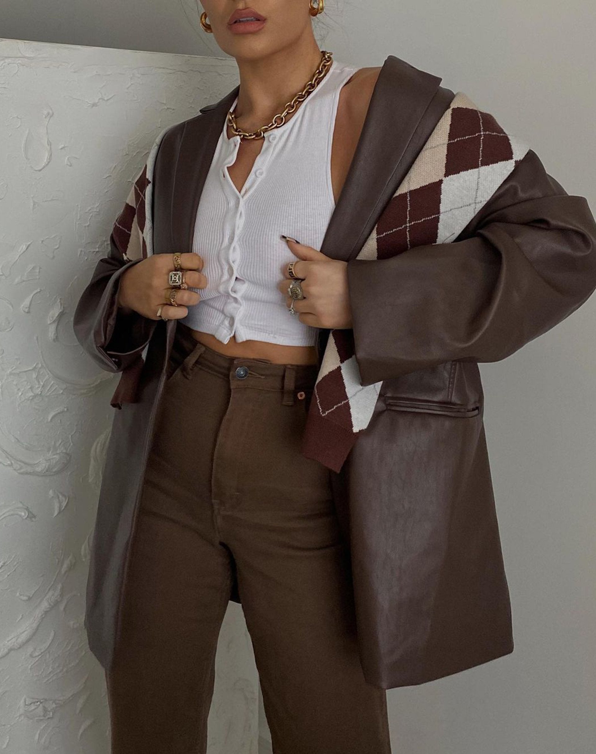 Onze Gilly top is de basic die je garderobe nodig heeft. Het heeft een mouwloze cropped fit, racerback met een ronde halslijn en een doorknoopbare voorkant in ribwit. Maak je look compleet met onze Zorea broek in PU zwart en laarzen.