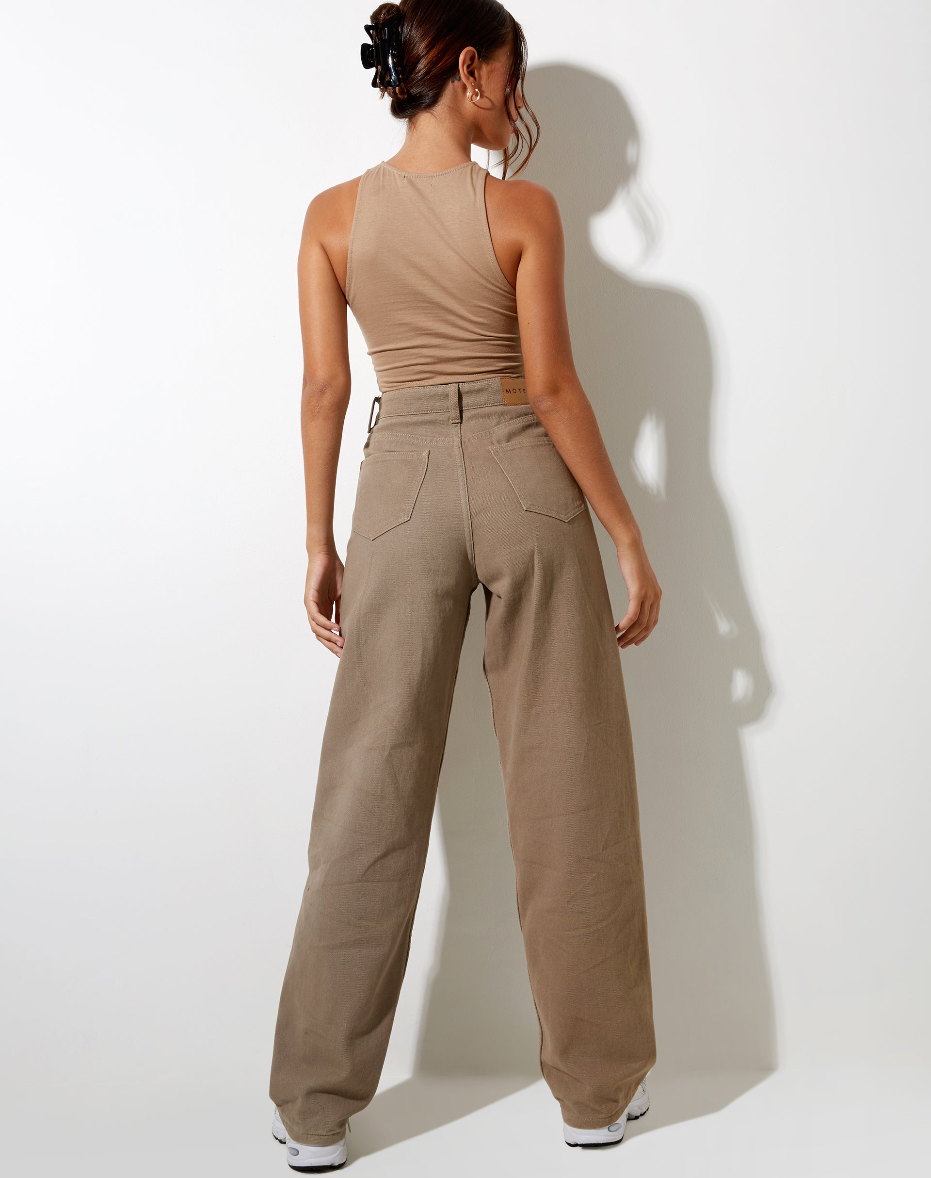 Houd het neutraal met de Giwta top. In een lichte begie-tint heeft het een mouwloos ontwerp met een bijgesneden pasvorm en verstelbare gekruiste bandjes aan de voorkant. We hebben de look afgemaakt met de Parallel Jean in Burnt Olive.