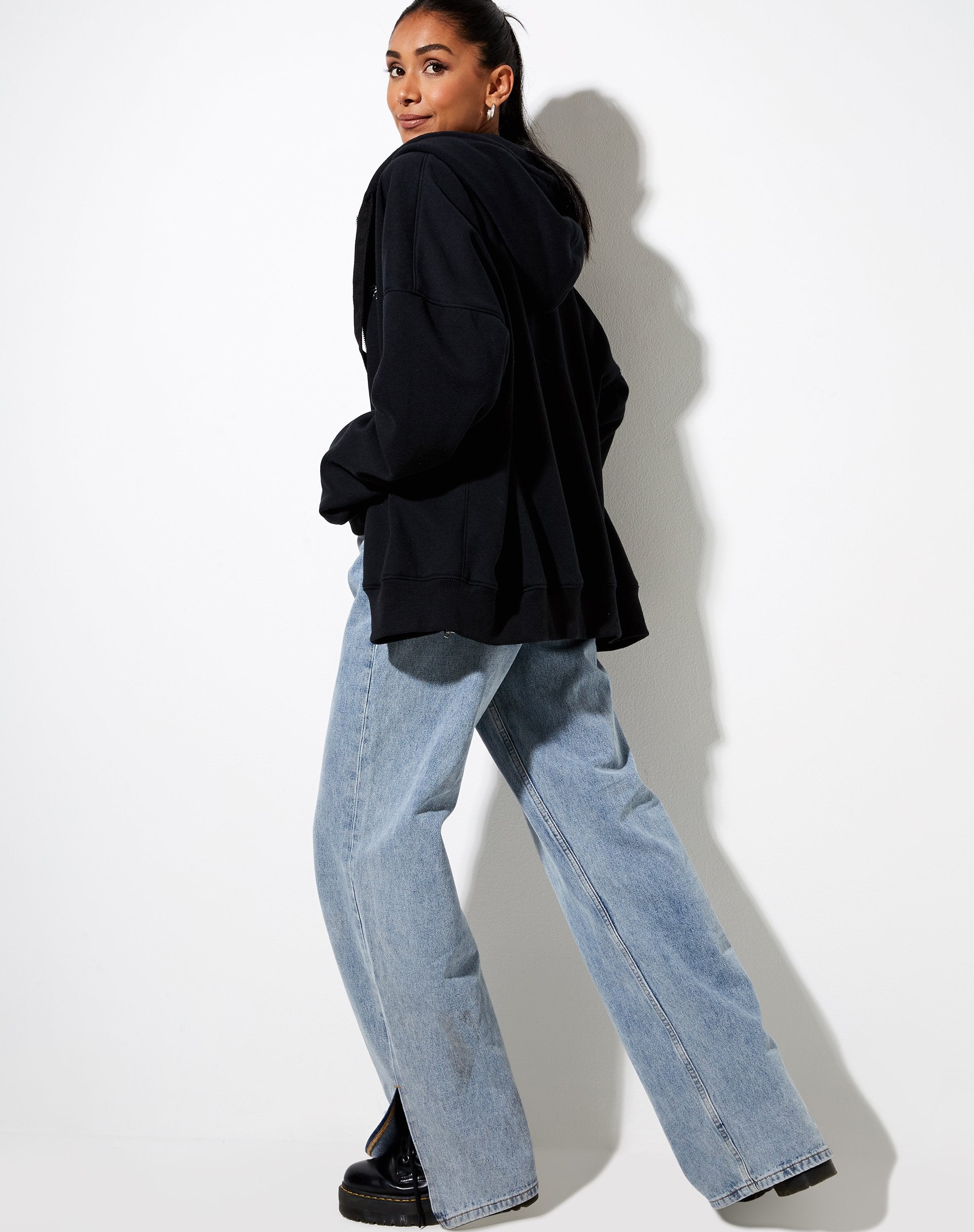 Onze Hollack Hoodie is perfect voor casual dagen. Hij heeft een losse pasvorm, een rits aan de voorkant en een capuchon in zwart met een geborduurde witte schorpioen. Maak je look af met een basic witte crop en onze jeans met gespleten zoom in lichte wassing.