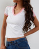 In een witte jersey stof, de Izolde tee heeft een bodycon pasvorm met een normale zoom, korte mouwen en een V-hals. Compleet met roze pijplijndetails en M-borduursel.