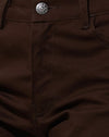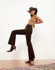 Onze Jopan Broek is het perfecte statement stuk. Uitgevoerd in twill bitter chocolate en heeft een laag uitlopende pasvorm met uitlopende pijpen in een stijlvolle bruine print. Maak je look af met onze Dena top in PU zwart.