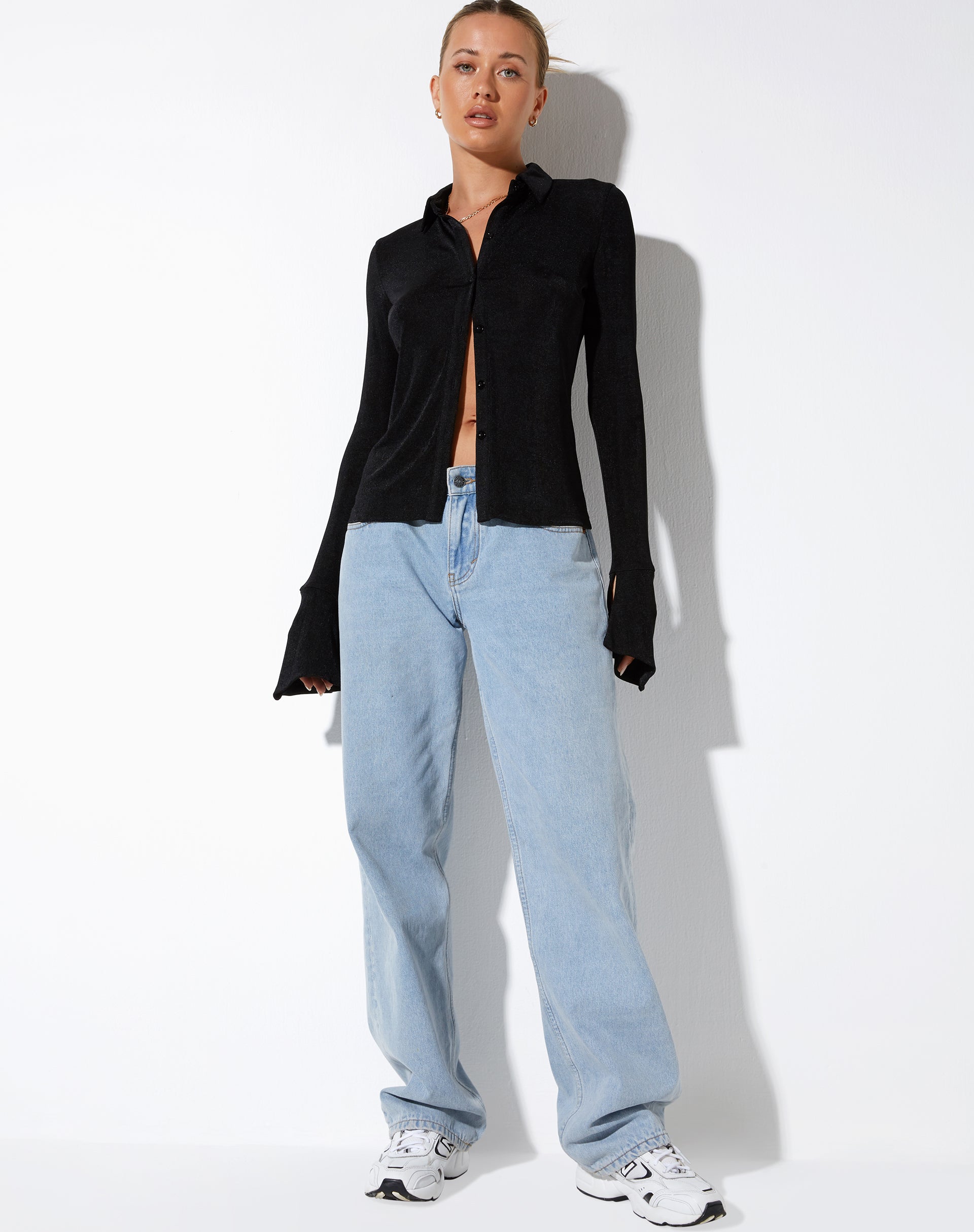 Voor een shirtis onze Keani er. Met lange mouwen en een knoopsluiting voor met kraag in zwart. Combineer met onze laag uitgesneden parallelle jeans en een dikke witte trainer.