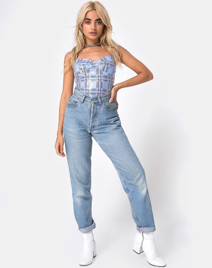Update je prints met een 90's check. Klaar voor het nieuwe seizoen, de Lantas lijfje heeft een subtiele pailletten versiering, met een bodycon pasvormsweetheart halslijn en stevige bandjes. Vloei moeiteloos van van dag tot nacht met een white wash denim en witte laklaars.