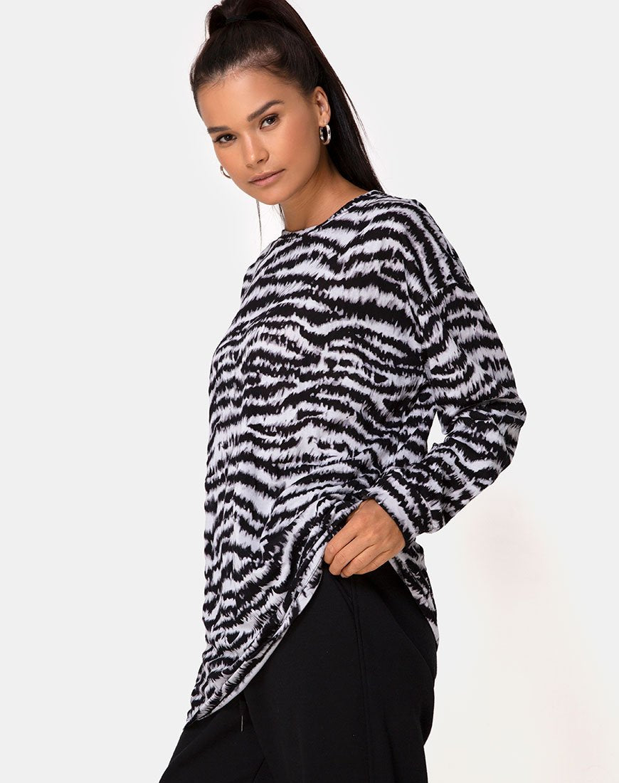 Maak het alledaagse stoer met ons lotsun sweatshirt. Deze coole sweatshirt heeft een opvallende dierenprint, lange mouwen voor wat bedekking en een comfortabele ronde hals. Voor een meer ontspannen gevoel combineer je dit met onze geribde witte fietsshort en een paar stevige zwarte sportschoenen en je bent klaar om te gaan.