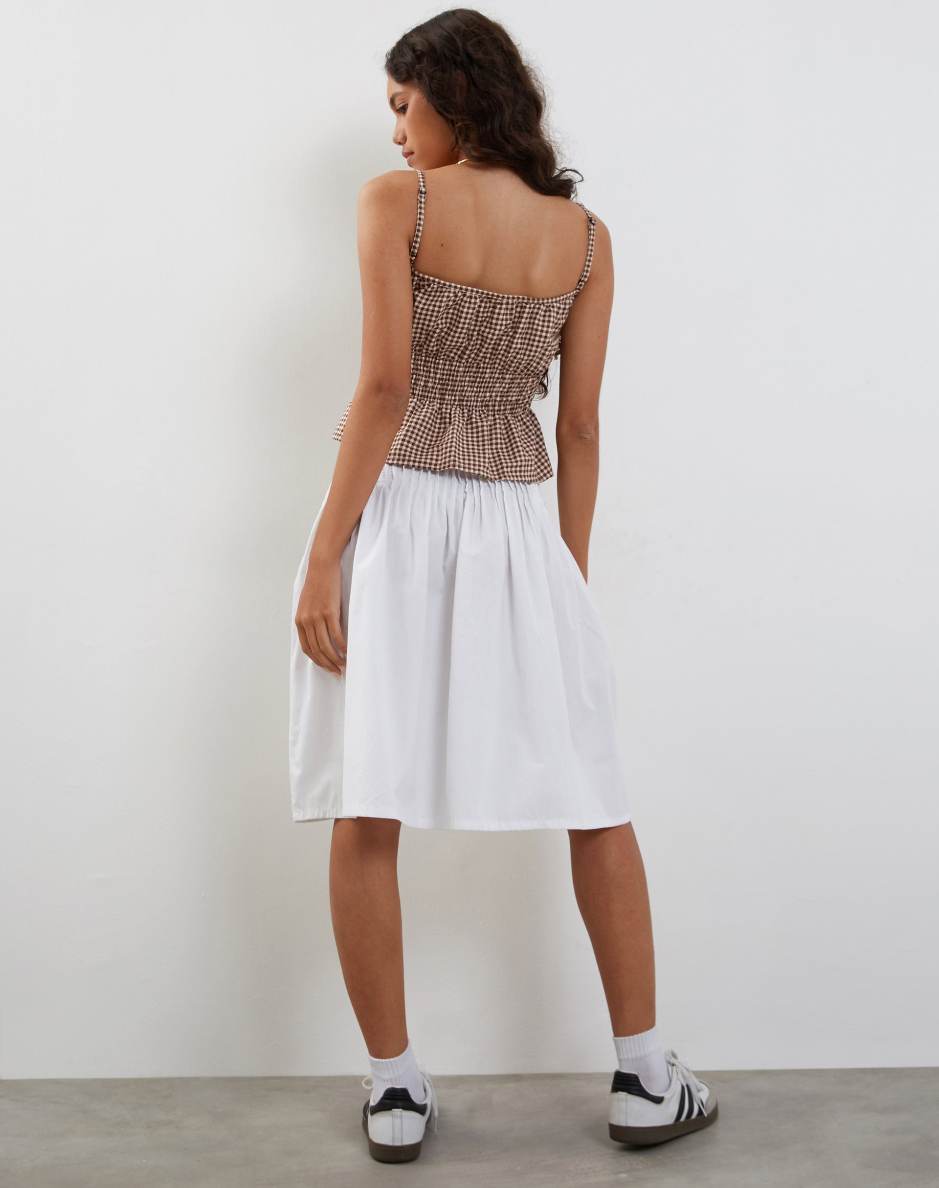 In een katoenen stof, de Lyncia top heeft een omslag in de taille met een regelmatige, peplum zoom, camibandjes en een vierkante halslijn met decoratieve bandjes. Gedetailleerd met een herhaalde mini gingham print. We hebben gecombineerd met onze India rok, voor de perfecte pasvorm.