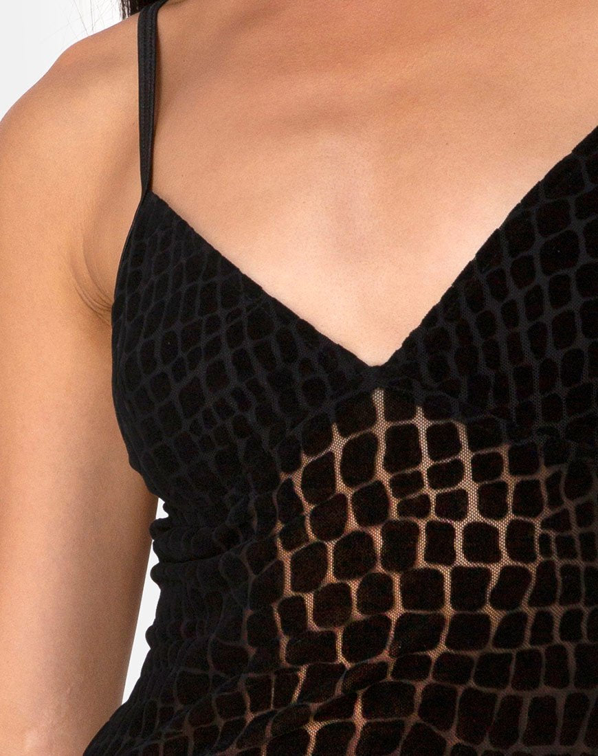 Leef je nog steeds voor mesh? Wij ook! De Maneda jurk in croc flock zwart is de perf feestjurk dit seizoen. Met een mini bodycon pasvorm, mesh panelen met krokodillenprint, een driehoekig gecupt bovenstuk en dunne bandjes. Draag het als een op zichzelf staand stuk met dikke laarzen en een imitatieleren jasje gedrapeerd over je schouders, of draag het als laagje over een zwart lijfje met lange mouwen.