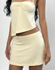 De Nidya rok in een citroenachtige rayonstof, heeft een a-lijn, lage taille, minipasvorm. Combineer met de Kins top.