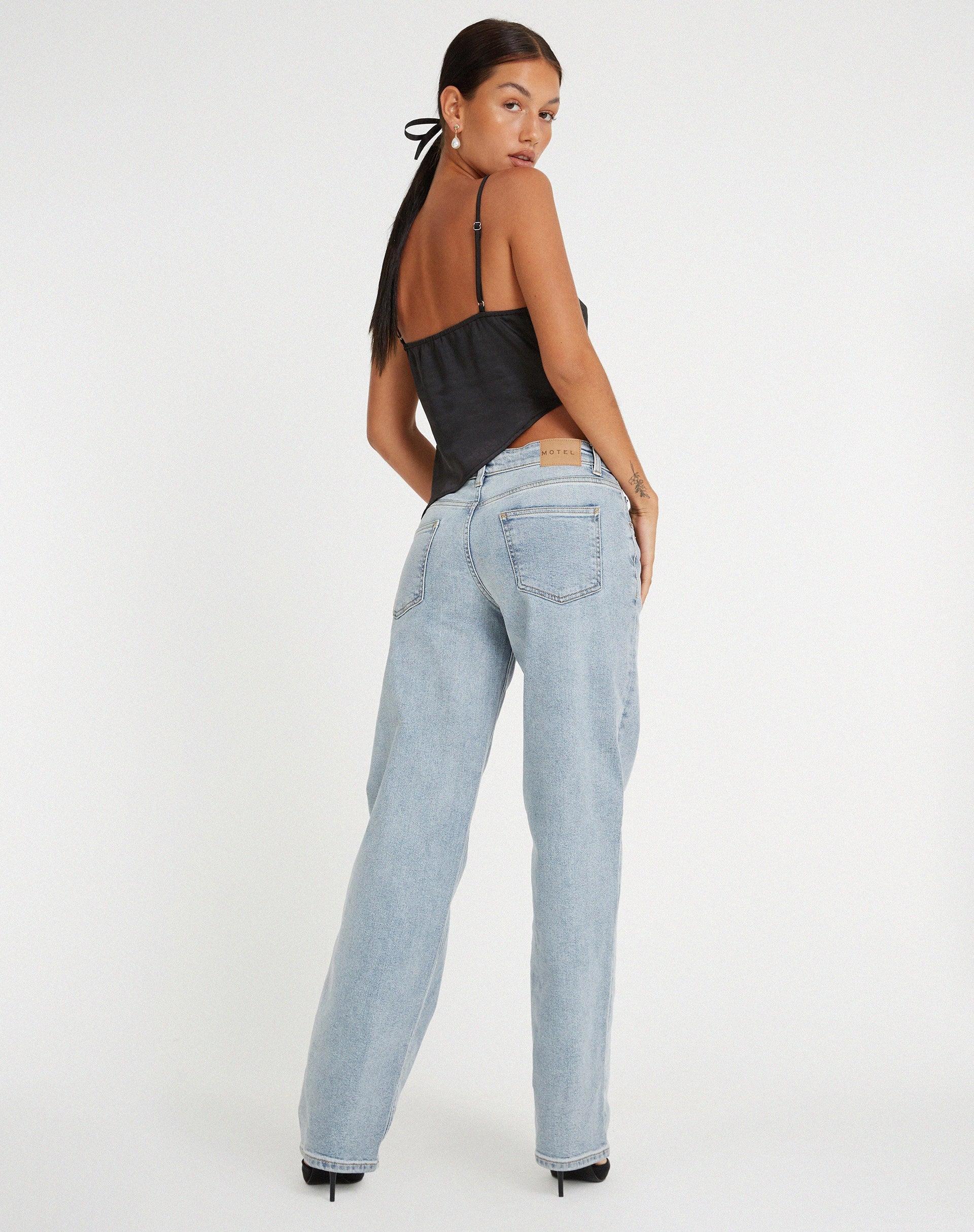 Strappy top van een zware satijnen stof met cowl halslijn, asymmetrische zoom en strikdetail aan de zijkant. Eenvoudig te combineren met de Low rise parallelle jeans in light wash blauw.