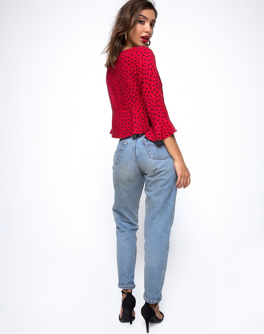 Denk aan 80's stippen en uitlopende wijdtes die je eruit laten zien alsof je net uit een salsales komt. De Vinequa top, in de rode en zwarte diana dot is een basisstuk voor het nieuwe seizoen, met een plunge halslijn met strikdetail, peplum zoomlijn en 4 wijde mouwen. Houd het casual voor een drankje in de namiddag met een verwassen denim en een hak met enkelbandje.