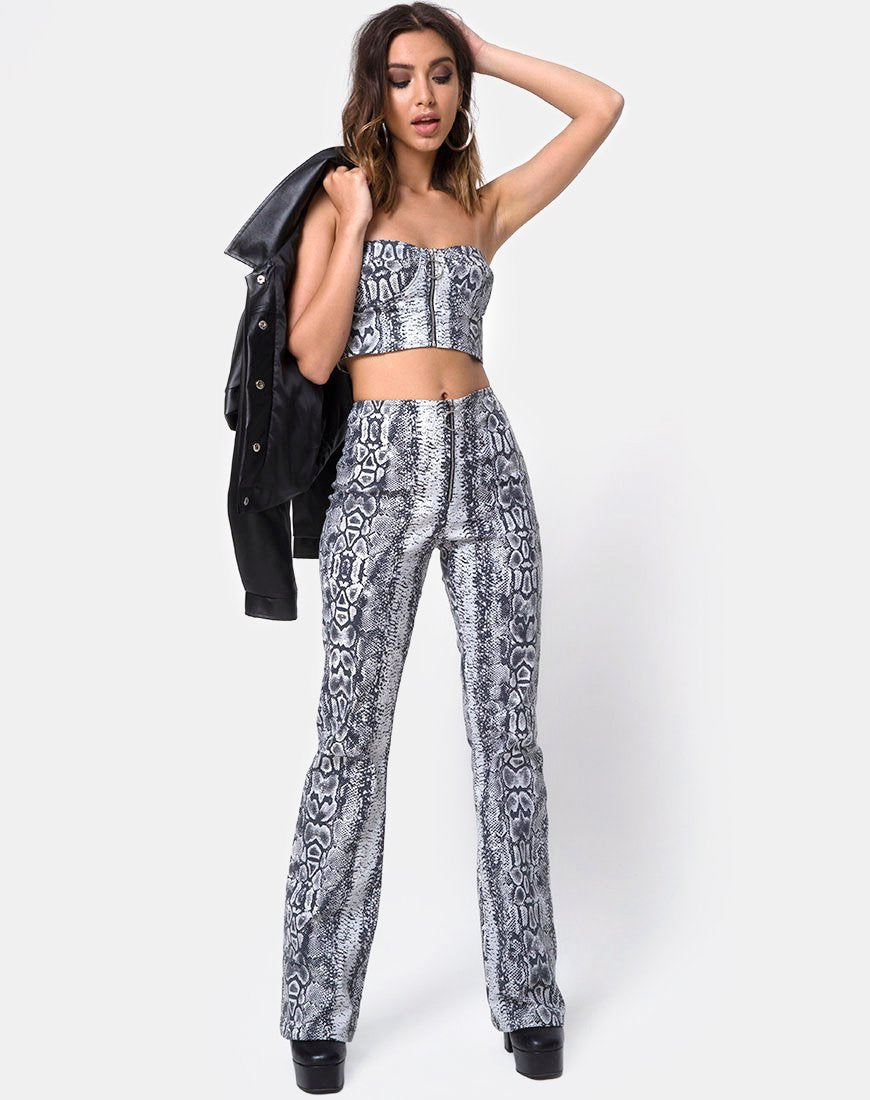 Zowel edgy als smoking hot, slangenprint is terug en op een grootse manier! Onze zolia broek is geschikt voor elk groot evenement met zijn hoge taille, uitlopende pijpen en ritssluiting. Maak de look compleet met de Zipshi Gewas voor woah van top tot teen!