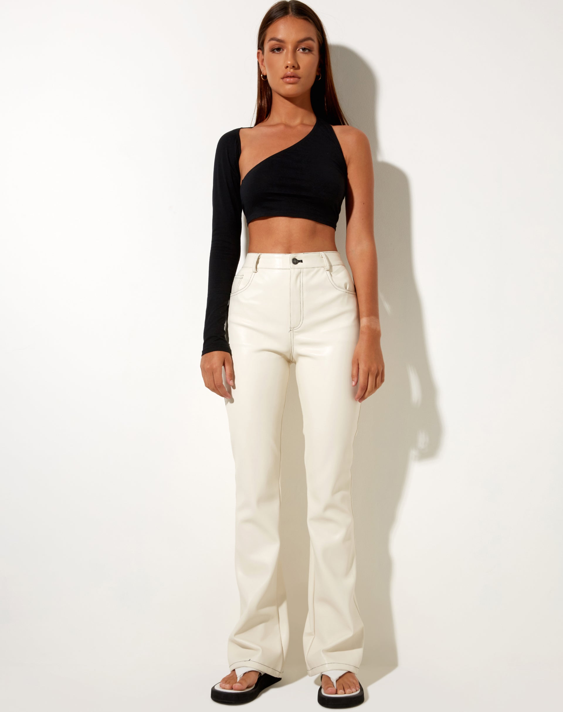 Geef je OOTD een edge met onze Zorea broeken. Met een hoog getailleerde pasvorm, uitlopende pijp en knoopsluiting in PU kokosmelk met zwarte stiksels. Maak je look af met onze Grasel crop top in zwart.